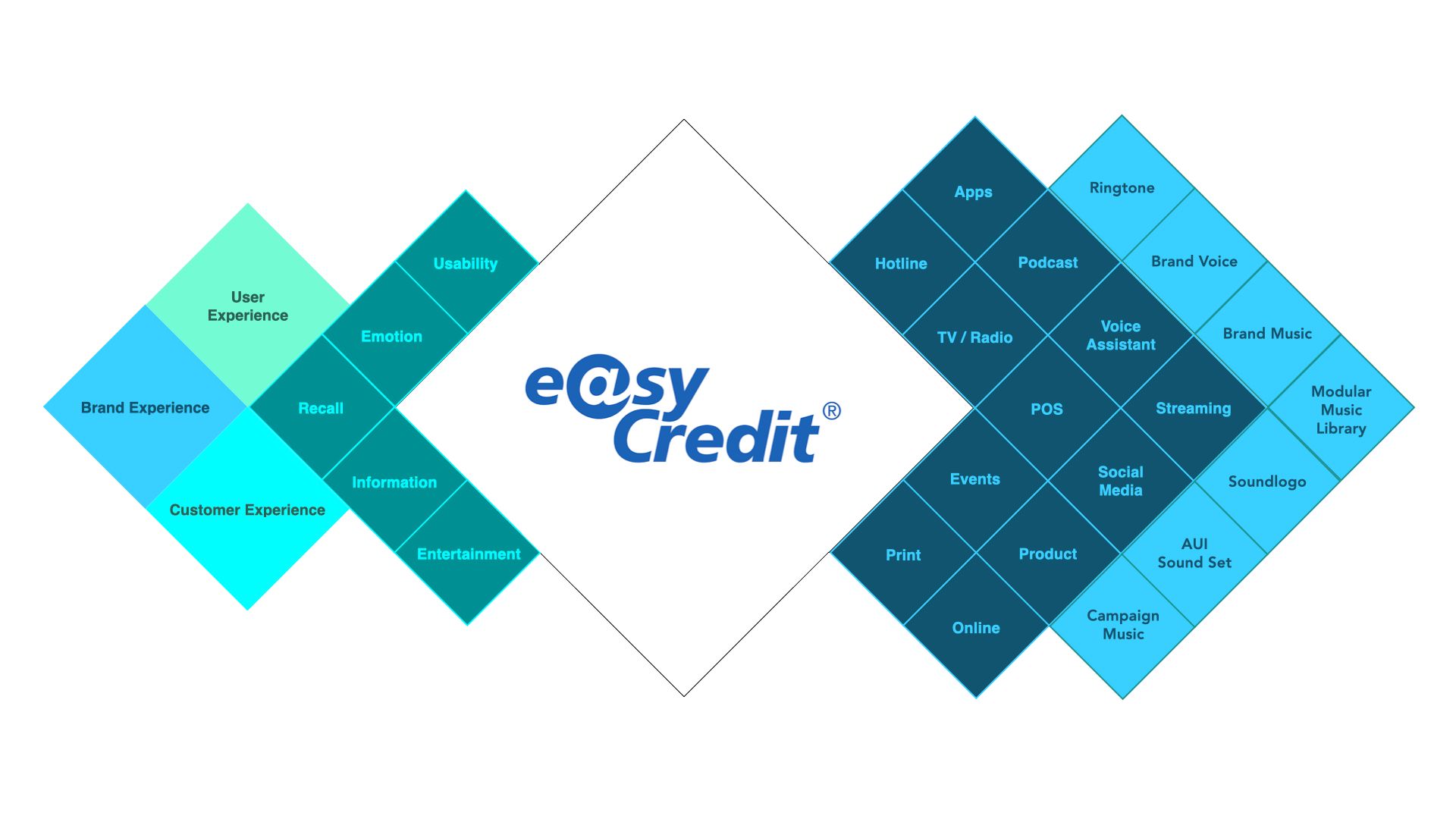 Im ersten Schritt wurde der akustische Kern der Marke definiert und in Form einer einzigartigen Klangwelt hörbar gemacht. Diese Klangwelt dient als inhaltlicher Rahmen für alle zu produzierenden akustischen Gewerke: Von Brandsong über Soundlogo bis hin zu den UX/UI Sounds. Der akustische Kern der Marke easyCredit wird so an jedem audio-visuellen Kontaktpunkt zur Geltung kommen.